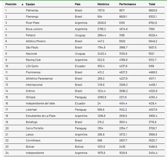 El líder y el escolta del ranking de clubes de la Conmebol para la temporada 2026 pasaron a ser los dos finalistas de la Copa Libertadores de este año, Palmeiras y Flamengo, respectivamente. El elenco paulista dejó la segunda posición y se convirtió en el nuevo líder, mientras que el Mengao —campeón de la última Copa Libertadores— pasó al segundo sitio.