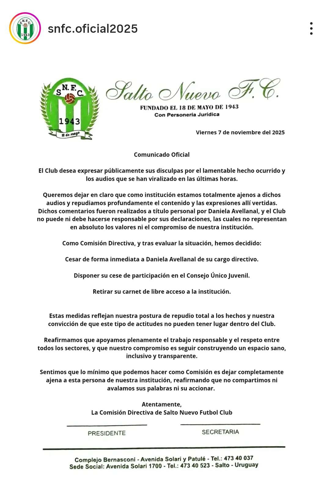 El Club Salto Nuevo desea pedir disculpas por el lamentable hecho ocurrido y los audios que se han difundido en las últimas horas